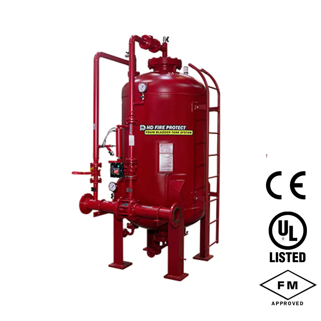 Upon system actuation, incoming water applies pressure to the rubber bladder, which supplies pressurized foam concentrate to the foam proportioning device (ratio controller). The foam ratio controller meters the foam concentrate into the fire water line, creating a foam solution. The solution is then piped to the discharge devices protecting the hazard area. Bladder tanks are available in horizontal and vertical mounting with a completely pre-piped option. These are very commonly used in low expansion foam fire fighting systems. HD Foam Bladder Tanks carry UL, FM and CE Approvals. Please contact our sales for further details on approvals and certifications.